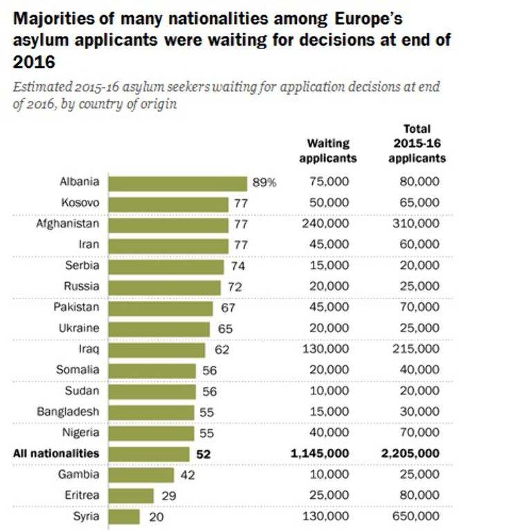 A 2016 végére már az ügyükben döntésekre váró európai menedékkérők kétharmada, vagyis körülbelül 760 ezer személy még nem kapott értesítést arról, hogy döntés született volna az ügyében.