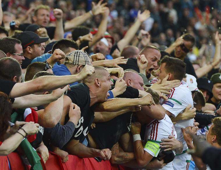 Csak egy kép, de mennyi ideig vártunk egy ilyen képre! Szalai Ádám a magyar szurkolók ölelõ karjai között, 2016 június 14-én Bourdeux-ban, miután az F csoport elsõ magyar vonatkozású meccsén a magyar labdarúgó-válogatott, Szalai és Stieber góljaival 2-0-ra legyõzte Ausztriát az Európa-bajnokságon.