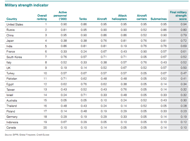 Stockholmi Nemzetközi Békekutató Intézet (SIPRI) 2015-ös számait felhasználva a kutatás kitér arra, hogy a nukleáris fegyverek korában a konvencionális hadsereg önmagában nem sokat ér. Viszont ebből a szempontból se az USA-nak, se Oroszországnak nincs oka a kesergésre, mivel ők ketten csücsülnek a világ atomfegyverinek több mint 90 százalékán. (businessinsider.com