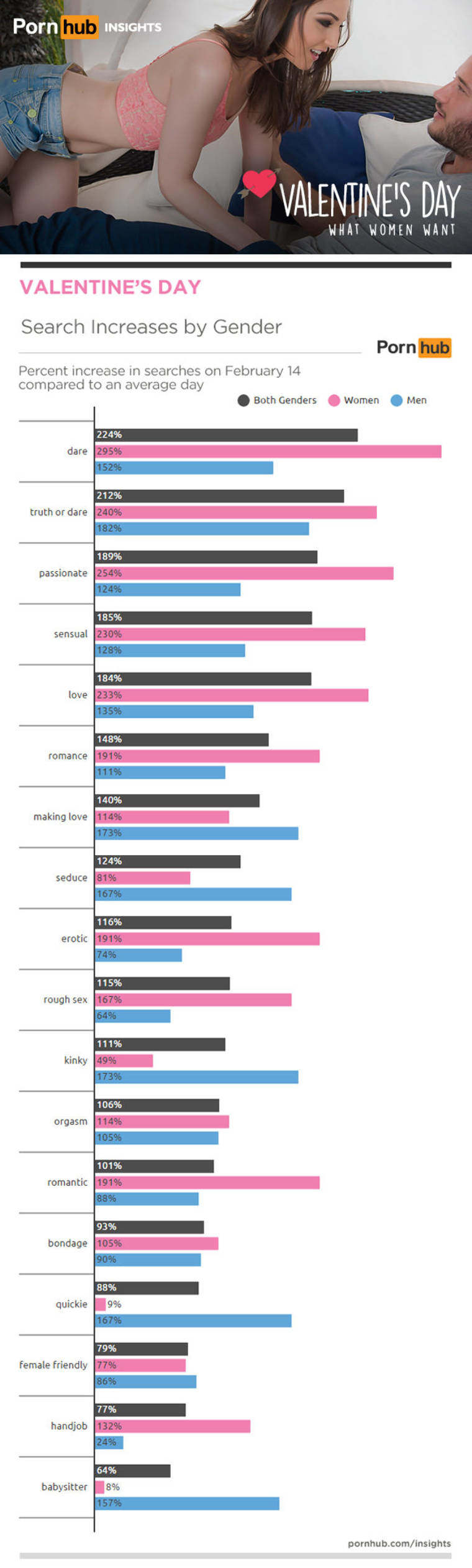 Február 14-én nemcsak a virágárusok forgalma sokszorozódik meg, hanem a pornóoldalak iránti érdeklődés is felpörög. A Pornhub kiszivárogtatott pár érdekes statisztikát arra vonatkozólak, hogy a hölgyek és az urak milyen címszavakra keresnek a leginkább a szerelmesek napján.