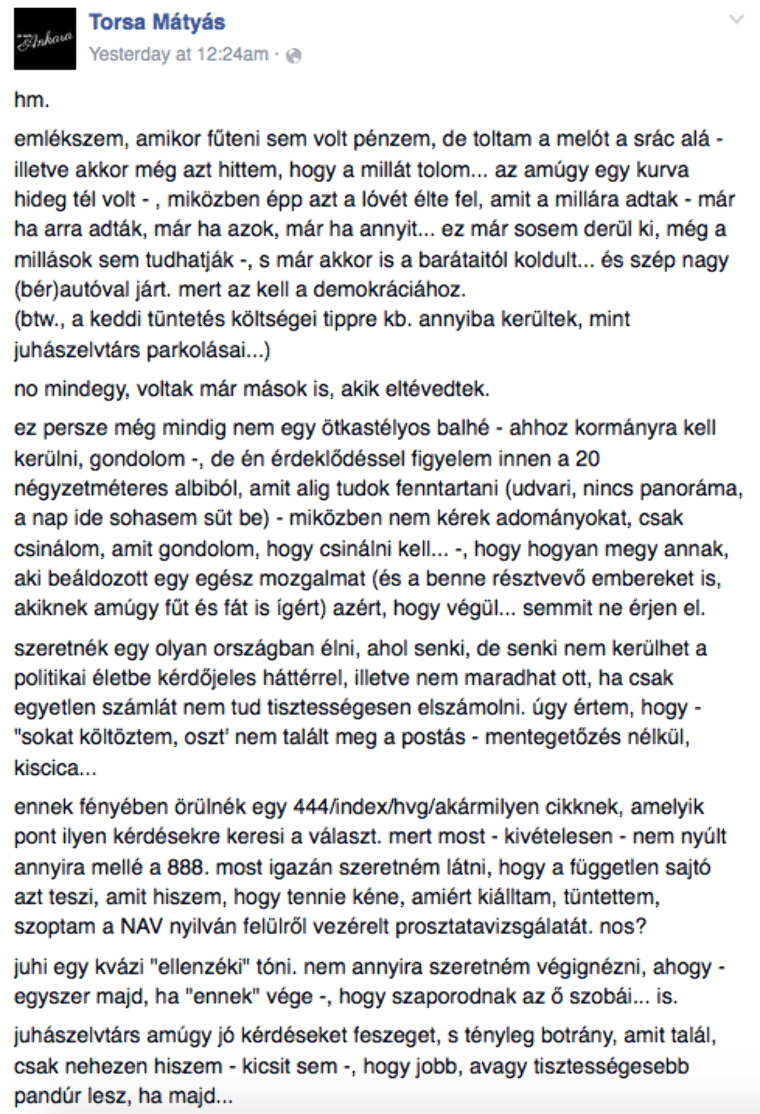 Õ nem válaszol, nem, ez támadás, ez karaktergyilkosság, és ő ezt nem tűrheti, ő a rendszer áldozata, derék ágrólszakadt baloldaliak csak úgy léteznek és kész, adományokat kapogatnak innen-onnan, mi közöd van neked ahhoz, hogy egy ellenzéki miből él szegényesen - ahogy ő mondja, biztosan olyan szegényes lehet a II. kerületi lét.